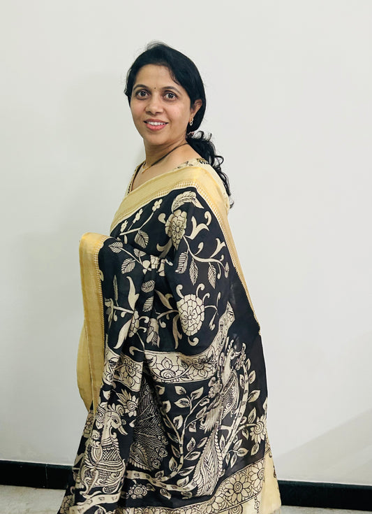Black Pen Kalamkari Bangalore silk Saree with blouse fabric