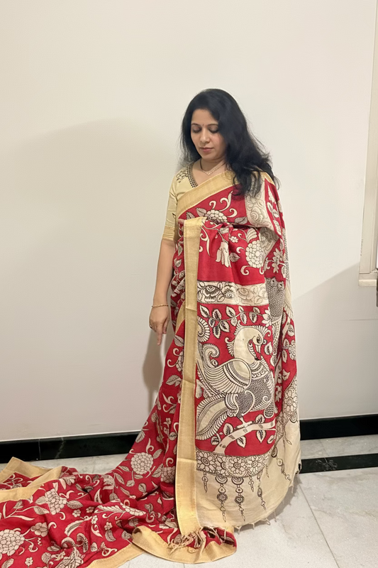 Red Pen Kalamkari Bangalore silk Saree with blouse fabric