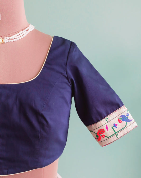 Navy blue Cotton Silk blouse with Paithani Border