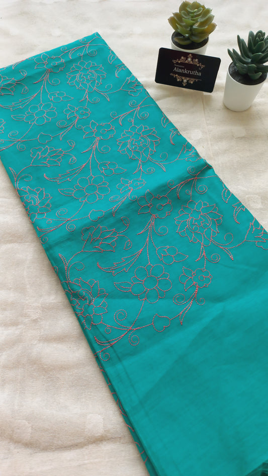 Unstitched Blue Cotton Silk Embroidered Blouse Fabric