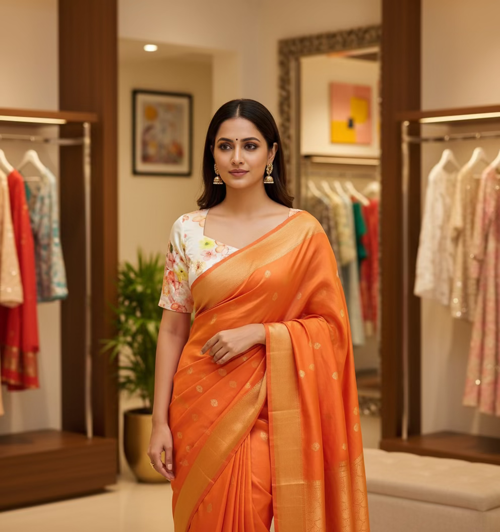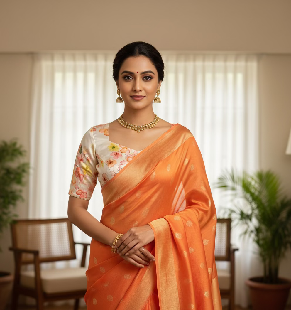 Elevate your saree collection with this stunning Floral Japan Satin Blouse, featuring vibrant reddish-pink , orange florals beautifully set against a crisp white base.