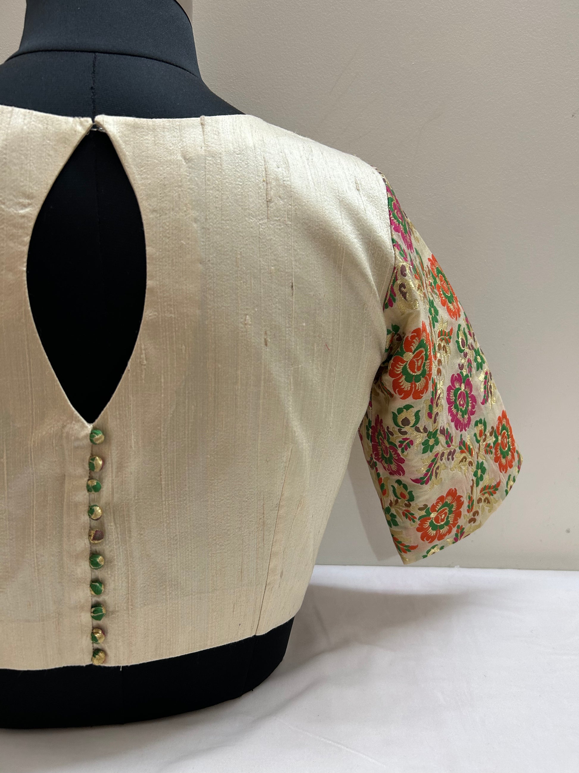 Crafted with a Pure light creamish gold raw silk body paired with beautifully floral brocade sleeves. The graceful front neckline and with back keyhole and potli buttons .